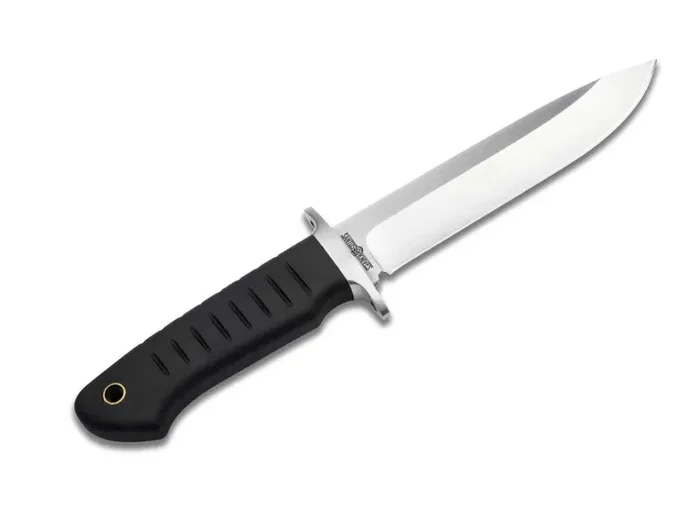 Die Löcher an den Außenseiten des Griffs bieten eine Möglichkeit zur zusätzlichen Befestigung, was das Messer für alternative Anwendungen wie das Verwenden als Speer für den Fischfang geeignet macht.