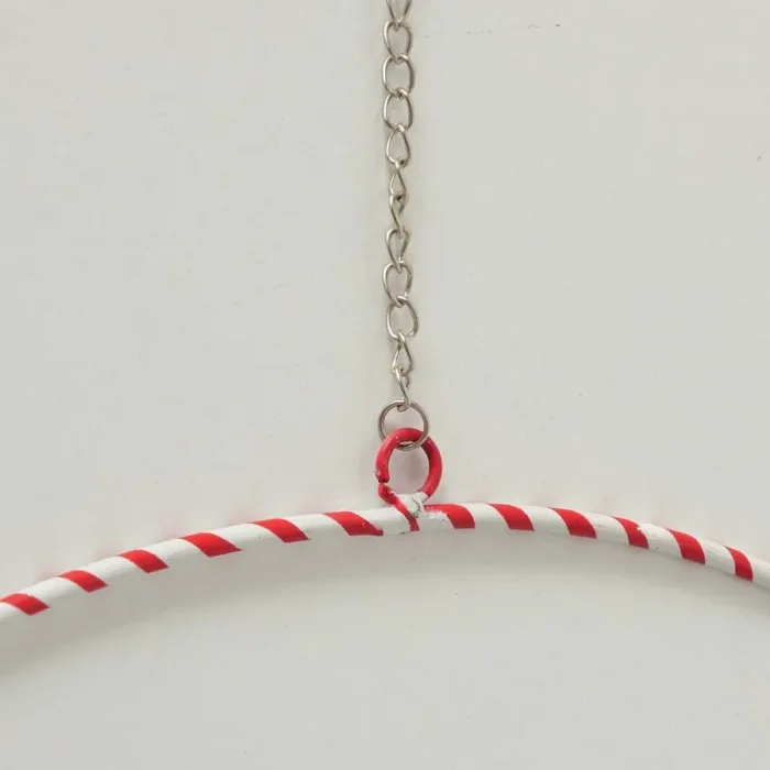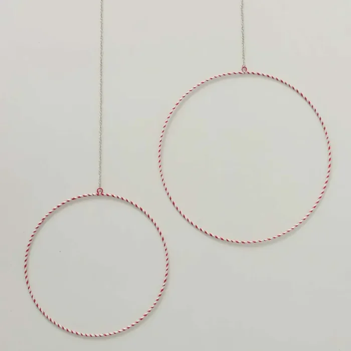 Der aus stabilem Metall gefertigte Ring ist rundum mit einer gedrehten Schnur in Rot und Weiß umwickelt und wirkt dadurch gleichzeitig zart und robust. Eine feine Kette mit Haken erleichtert das Aufhängen an der Wand, am Fenster oder an der Decke. Die hochwertige Verarbeitung garantiert, dass der Anhänger jedes Jahr aufs Neue im Einsatz sein kann. Durch seine neutrale Form lässt er sich spielend leicht mit Zweigen, Bändern, Trockenblumen oder Lichterketten dekorieren – ganz nach deinem Geschmack.