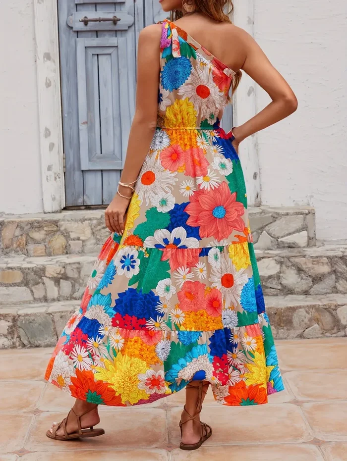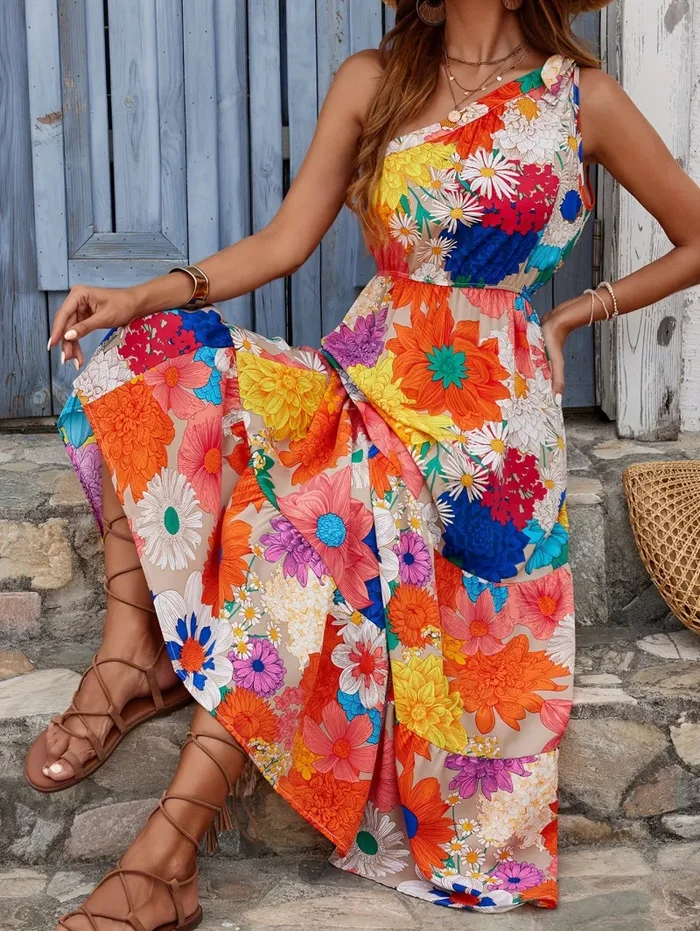 Erstrahle in lebendigen Farben mit dem bunten Blumen-Maxikleid – Fiona. Dieses Kleid ist eine Ode an den Sommer mit seinem reichen Blumenmuster, das eine Vielzahl von Farben in einem ansprechenden Design vereint. Der fließende Schnitt und die leichte Stoffqualität bieten ultimativen Tragekomfort und Bewegungsfreiheit.
