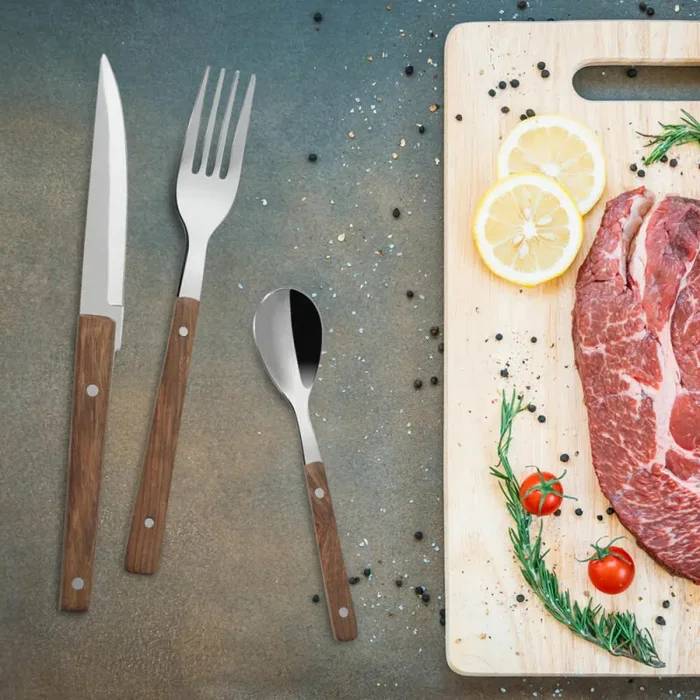 Besteck-Set 24 Teile aus hochwertigem Edelstahl 18/10 mit Holzgriffen. Spiegeloberfläche. Begeben Sie sich auf eine Reise in eine winterliche Berglandschaft. Das warme Holz in Ihren Händen lässt Sie an die behagliche Wärme eines Kamins denken. Stahlstruktur mit weicher Außenfläche. Für eine längere Lebensdauer empfiehlt es sich, das Besteck von Hand zu spülen und rasch abzutrocknen.