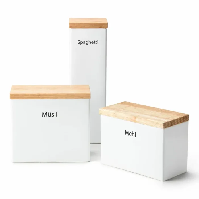 Die praktische Vorratsdose aus weißer Keramik passt mit dem hellen Holzdeckel in jede Küche. Damit alles gut verschlossen bleibt, ist im Deckel ein Siliconring integriert. Die Änderung der Beschriftung ist kein Problem – innen liegen Etiketten mit alternativen Beschriftungen.