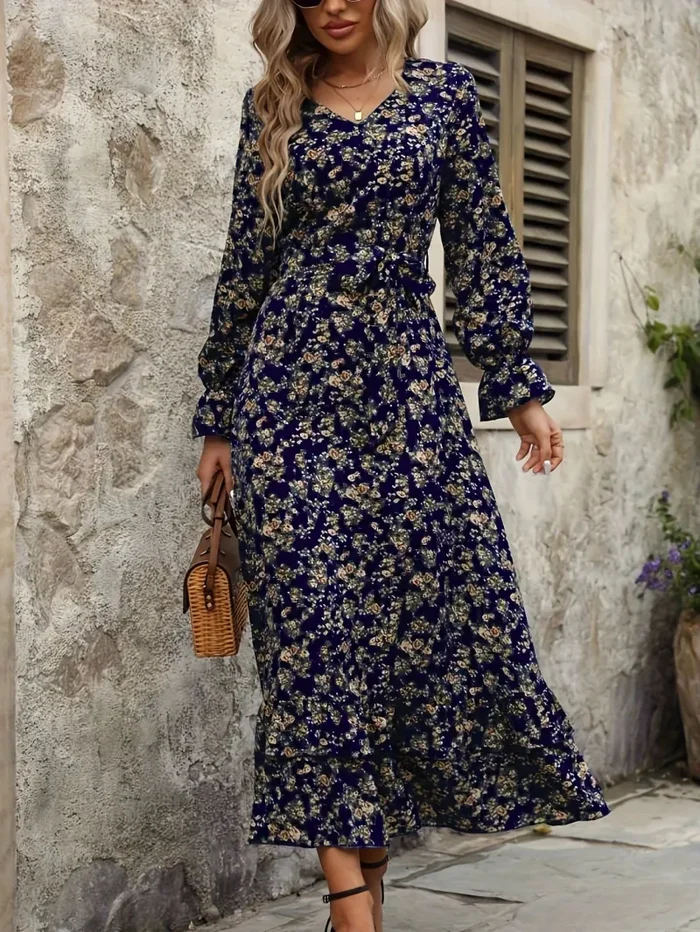 Erleben Sie die romantische Eleganz und den Komfort unseres dunkelgrünen Blumenkleids mit Gürtel. Dieses Kleid ist ideal für Frauen, die einen femininen und stilvollen Look bevorzugen.
