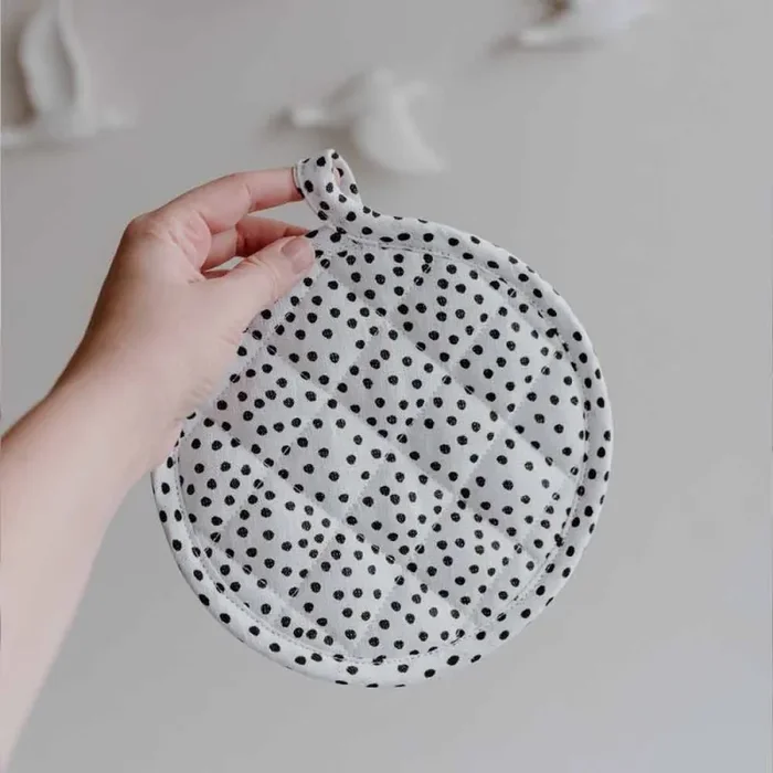 Mit den runden Topflappen „Punkte“ bringst du nicht nur Sicherheit, sondern auch skandinavische Leichtigkeit in deine Küche. Die verspielten schwarzen Punkte auf cremig weißem Hintergrund zaubern dir ein Lächeln ins Gesicht, selbst wenn der Topf brodelt. Durch die weiche Füllung schützt dich das 2er‑Set zuverlässig vor Hitze – so gelingen Auflauf, Kuchen und Co. ganz entspannt. Dank der praktischen Aufhängeschlaufen hast du sie immer griffbereit.