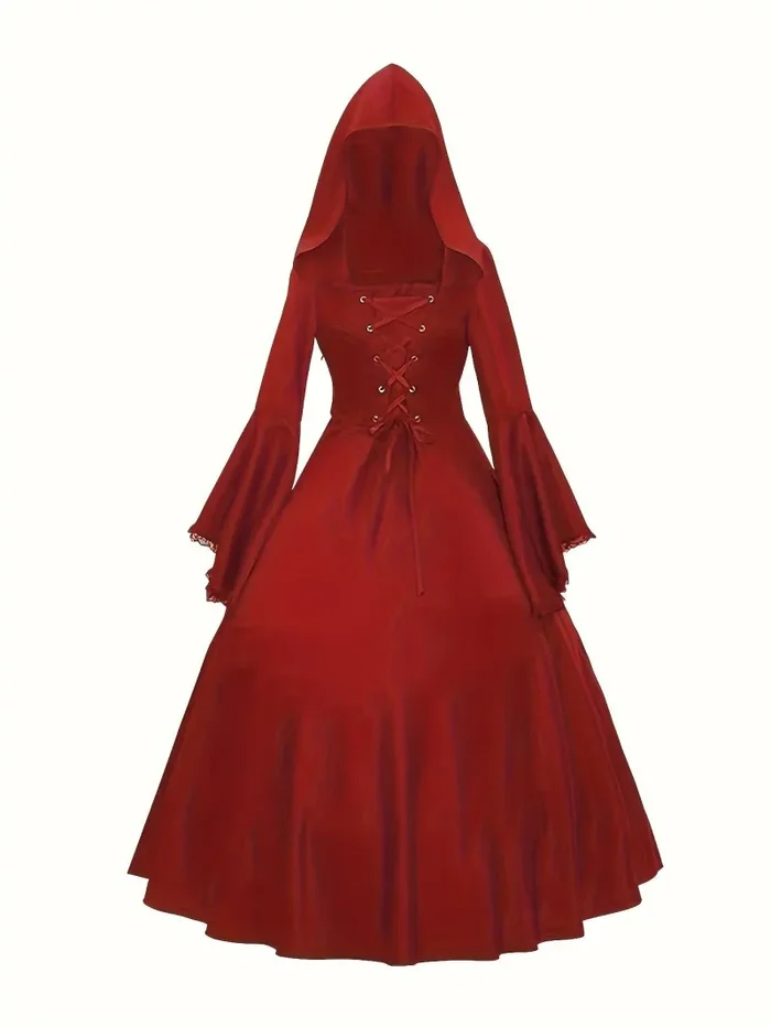 Dieses atemberaubende schwarze Gothic-Kleid versetzt dich direkt in die mystische Welt der Hexen und Zauberinnen. Mit seiner dramatischen Kapuze und der Schnürung vorne strahlt es dunkle Eleganz und Mysterium aus – ideal für Halloween, Kostümfeste oder Fantasy-Events.