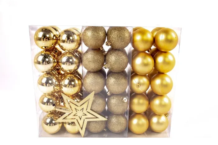 61 teiliges Weihnachtskugel-Set mit drei verschiedenen Kugelarten und dem passenden Stern für den Weihnachtsbaum. Darin enthalten sind glitzernde, glänzende und matte Kugeln in der Farbe Gold. Genießen Sie die schöne Weihnachtszeit und Ihren prachtvoll geschmückten Weihnachtsbaum mit unseren passenden Christbaumkugeln. Im Set ebenfalls enthalten sind Anhänger aus Metall. So lassen sich die Weihnachtskugeln noch viel bequemer und schneller am Tannenbaum anbringen. Durch die verschiedenen Kugelarten spiegelt sich das Licht Ihres Weihnachtsbaums hervorragend wider. Verwandeln Sie Ihren Christbaum zum Highlight Ihrer Weihnachtsdekoration mit diesem wunderschönen Christbaumschmuck. Anders als bei den meisten 100er Sets bekommen Sie hier ausschließlich große Kugeln mit einem Durchmesser von Ø 6 cm. Somit erhalten Sie viel mehr größere Kugeln womit Ihre Weihnachtsbäume bestens geschmückt werden können. Die Sternspitze für Ihren Weihnachtsbaum rundet das Gesamtbild perfekt ab. Wir wünschen Ihnen viel Spaß beim dekorieren!