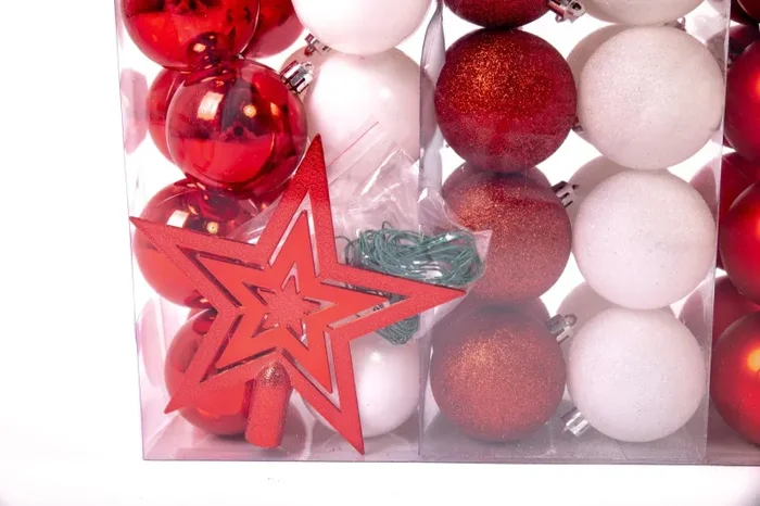 Großes Weihnachtskugeln Set 61 teilig Ø 6 cm Weiß/Rot inklusive Sternspitze Weihnachtsbaumschmuck