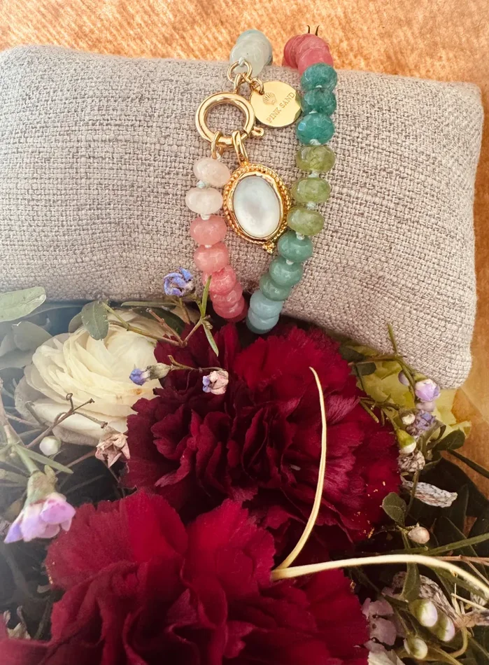 Diese elegante Kette aus Jade mit eingefärbten Steinen strahlt in sanften, harmonischen Tönen. Sie ist mit einem goldigen Perlmutt-Anhänger erhältlich, der einen milchigen Stein in der Mitte trägt. Dieses bezaubernde Schmuckstück verbindet natürliche Schönheit mit edlem Design und ist ein echter Hingucker für jedes Outfit.
