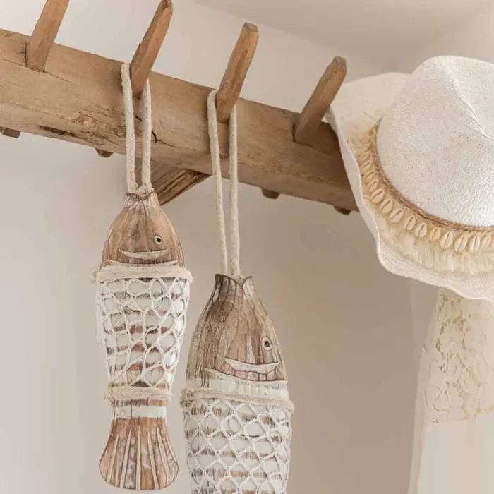 Das Duo aus dekorativen Fischen bringt maritimes Flair direkt in dein Zuhause. Die beiden Figuren aus naturbelassenem Albasiaholz werden mit liebevollen Details wie dezenten Schnitzereien und eingearbeiteten Jutebändern geliefert. Ihre schmale Silhouette und die warmen Beigetöne sorgen für eine ruhige, nordische Ausstrahlung. An der praktischen Aufhängeschlaufe aus Hanf lassen sich die Fische einfach an Wänden, Garderoben oder Fenstern befestigen und setzen dort einen dezenten Blickfang.