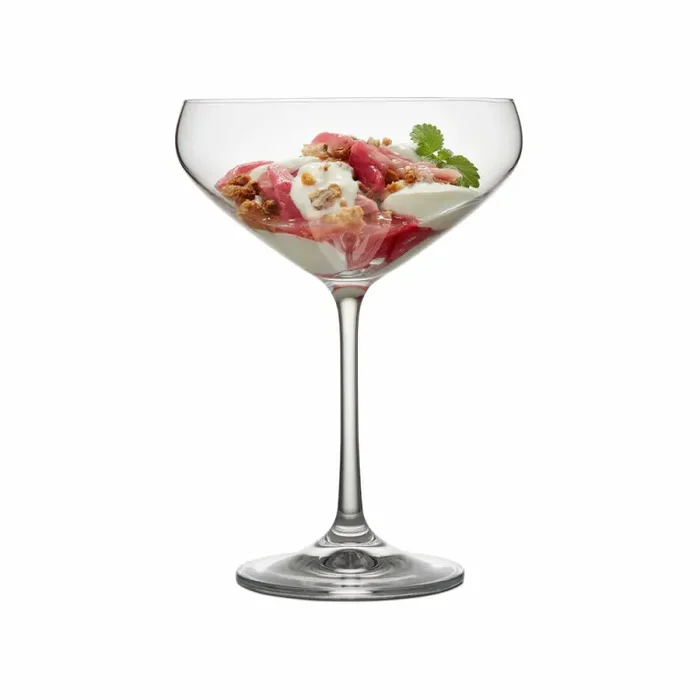 Juvel Champagner-Schale 34 cl. Der hohe Stiel verleiht dem Glas einen hübschen und stilvollen Ausdruck, und es ist mit seinem zeitlosen Design ein klassisches Glas. Das Glas passt zu jeder Tischdekoration und kann sowohl als Champagnerglas und Cocktailglas als auch zum Servieren von Vorspeisen und Desserts verwendet werden.