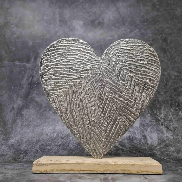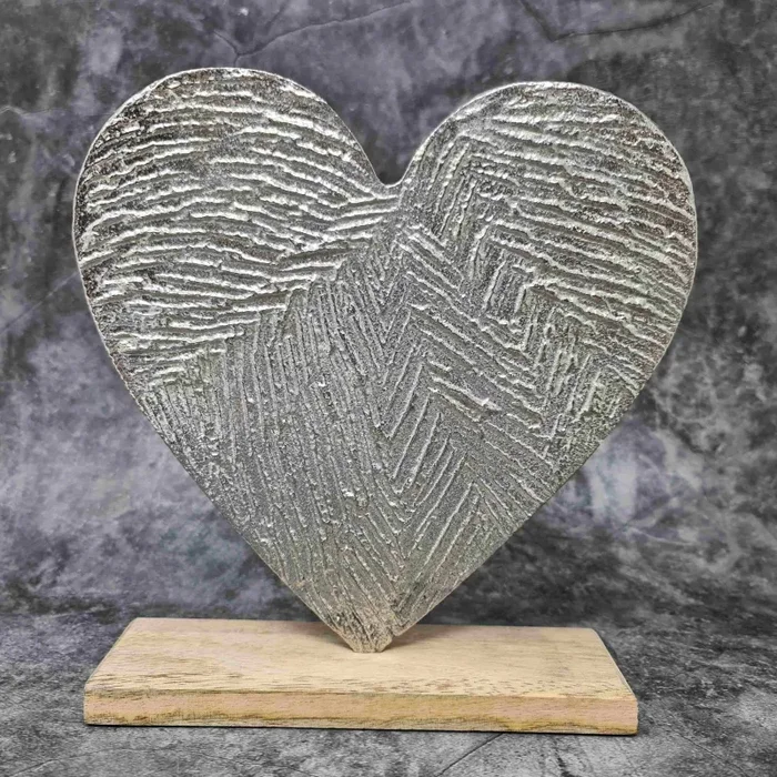 Moderne Skulptur Dekofigur Herz aus Aluminium auf Sockel aus Holz Silber/braun 18×21 cm