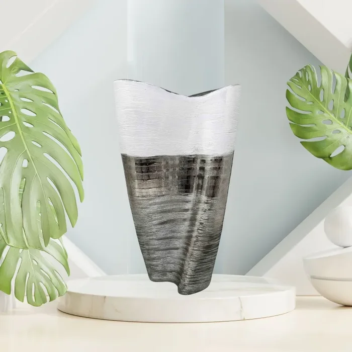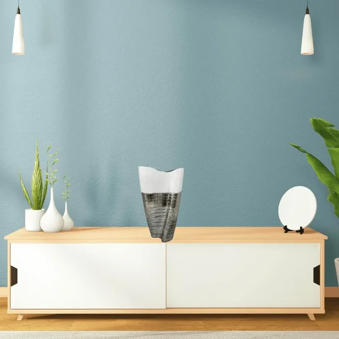 Aufwendig hergestellt besteht diese Vase aus Keramik in den Farben weiß und silber. Die Blumenvase ist mit einem silbernen Rand versehen, welcher der Vase ihren besonderen Charme verleiht. Die Vase hat eine Gesamthöhe von 35 cm. Gefüllt mit künstlichen Blumen, Blumensträußen oder Grünzusätzen für ein beeindruckendes Gesamtbild, das sofort Wohnzimmer, Schlafzimmer, Lounges und Büros verschönert. Wunderbares Akzentstück für Couchtische oder Beistelltische. Bietet ein modernes Gefühl, um die Persönlichkeit Ihrer Wohnkultur zu betonen. Perfekt für den täglichen Gebrauch, Hochzeit, Veranstaltungen, Events, Restaurants und andere besondere Anlässe. So vereinen sich natürliche Strukturen, modernes Design und traditionelle Verarbeitung zu einem hochwertigen Wohnaccessoire, das sich sehen lassen kann. BESONDERES GESCHENK die dekorative und moderne Tischvase eignet sich auch als hochwertige Überraschung oder originelle Geschenk-Idee für einen lieben Menschen oder als Dekoration für feierliche Anlässe wie Hochzeit, Geburtstag, Weihnachten und Jubiläum.