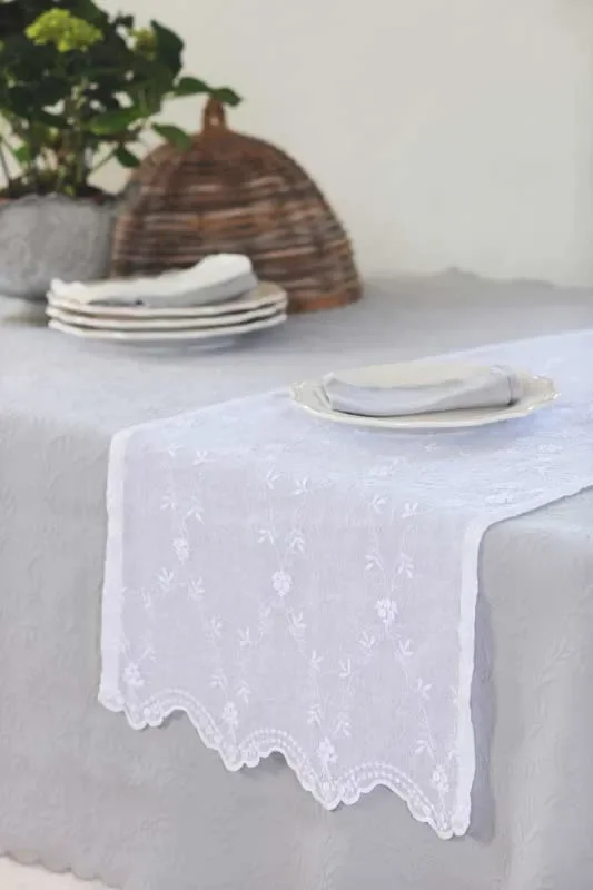 Ein bezaubernder Tischläufer mit schönem kleinen Rosen-Muster und aufwendiger Stickerei am Saum im Vintage-Rose-Ton. Er versprüht romantischen Landhaus-Flair auf Deinem Tisch oder Deiner Kommode.