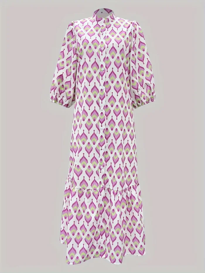 Erleben Sie die verspielte Eleganz und den Komfort unseres pink-weißen Maxikleids mit Muster. Dieses Kleid ist ideal für Frauen, die einen auffälligen und dennoch stilvollen Look bevorzugen.