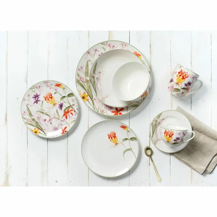 Blühende Fantasie: Flora ist inspiriert von der paradiesischen Schönheit und Opulenz exotischer Blumen. Das Besondere der Kollektion besteht darin, dass die mit Liebe zum Detail gezeichneten Blüten und Blätter in mehreren Motiv- und Farbvarianten gestaltet wurden, aus denen man sich nach Belieben sein ganz individuelles Blumenparadies zusammenstellen kann. Mit seiner charmanten Eleganz und Raffinesse zaubert Flora sowohl beim gemütlichen Familien-Brunch wie auch beim festlichen Mehr-Gänge-Menü ein unwiderstehliches Tischambiente.