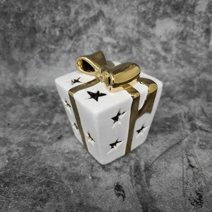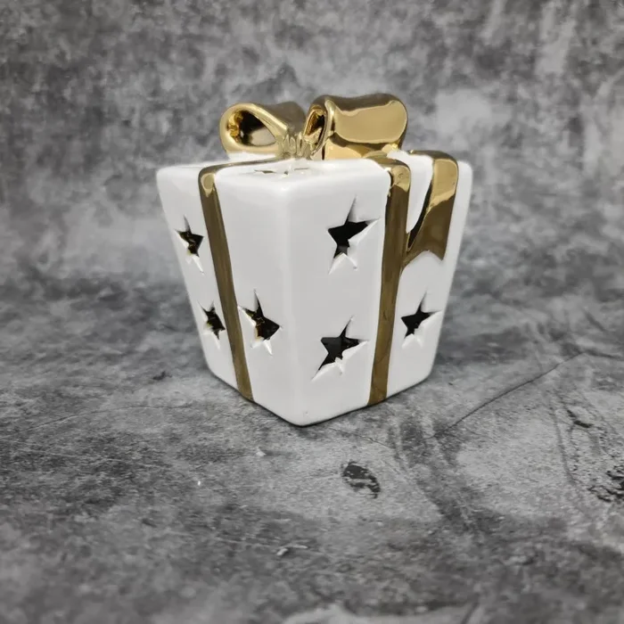 Wunderschön verarbeitetes Deko Geschenkpaket. Das Geschenkpaket besteht aus Keramik in der Farbe weiß und ist mit goldenen Schleifen verziert. Eine wunderbare Dekovariante zu Weihnachten. Das Weihnachtliche Paket verfügt über eine LED Beleuchtung. Die Dekofigur hat eine Höhe von 9 cm und eine Breite von 8 cm. Verschönern Sie Ihre Weihnachtsdekoration mit diesem tollen Produkt.